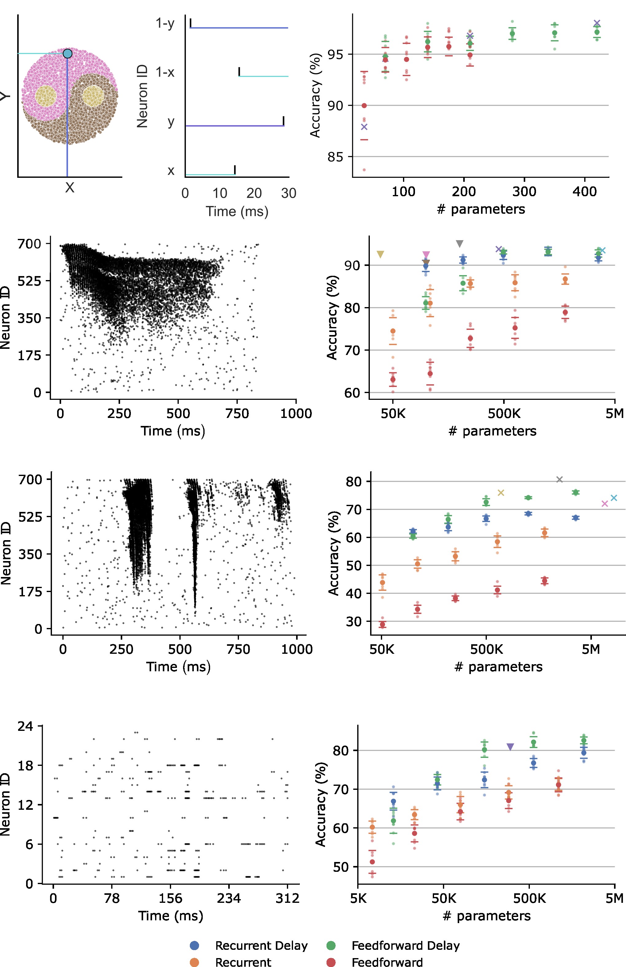 We test our implementations on the Yin-yang, Spiking Heidelberg Digits, Spiking Speech Commands, and Braille letter reading datasets. We find the delays are always a useful addition, and interestingly, they become particularly useful in small recurrent networks.